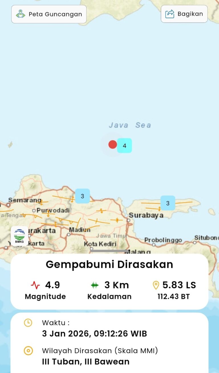 UPdates - Gempa bumi berkekuatan magnitudo (M) 4,9 mengguncang wilayah Laut Jawa dekat Pulau Bawean, Kabupaten Gresik, Jawa Timur, Sabtu, 3 Januari 2026 pada pukul 09.12 WIB.