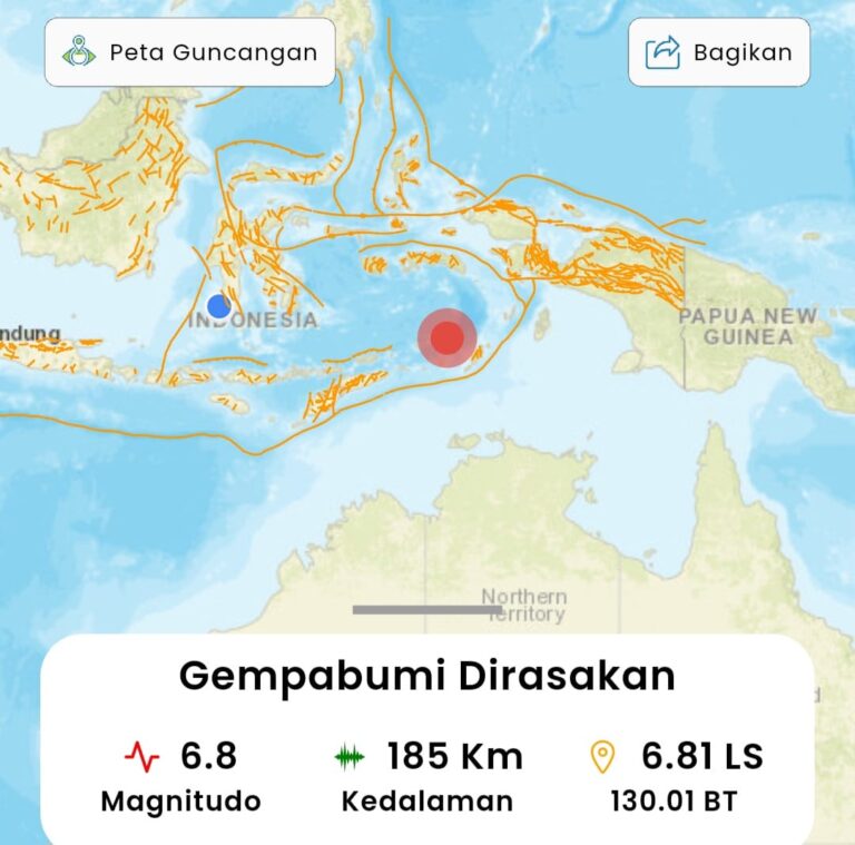 UPdates - Gempa bumi berkekuatan besar yakni Magnitudo (M) 6,8 mengguncang wilayah Kabupaten Kepulauan Tanimbar di Provinsi Maluku pada Selasa malam, 28 Oktober 2025, pada pukul 21.40 WIB.