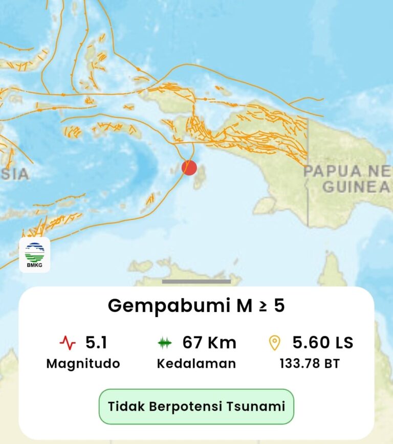 Titik koordinat gempa berada pada 5.60 Lintang Selatan dan 133.78 Bujur Timur dan berada pada kedalaman 67 km. Menurut BMKG, gempa ini tidak berpotensi tsunami.