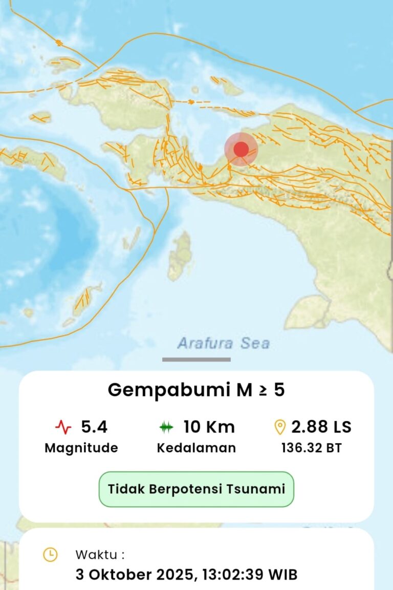 UPdates - Gempa bumi Magnitudo (M) 5,4 mengguncang wilayah Waropen, Papua, Jumat, 3 Oktober 2025.