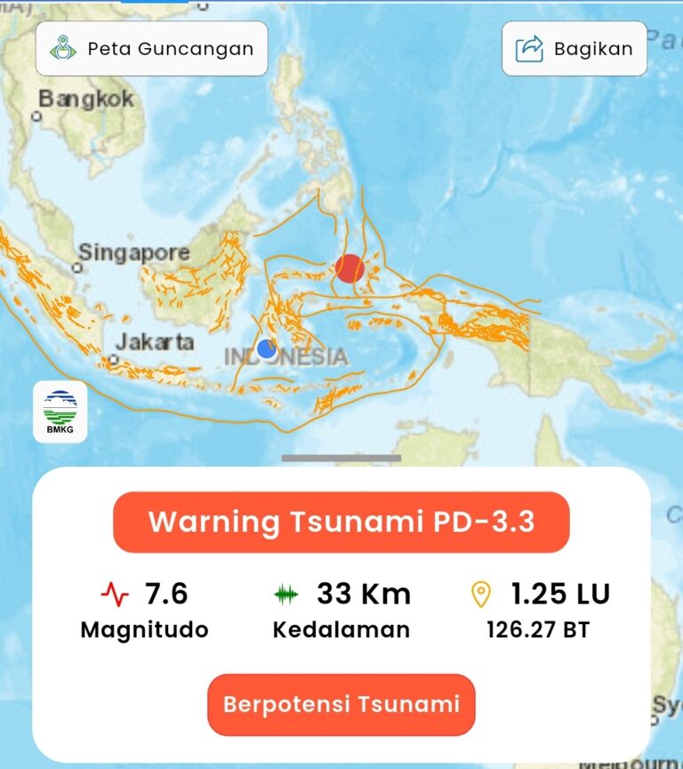 UPdates - Badan Meteorologi, Klimatologi, dan Geofisika (BMKG) melaporkan terjadinya gempa Magnitudo 7,6 di wilayah tenggara Bitung, Sulawesi Utara (Sulut) dan sekitarnya pada Kamis, 2 April 2026.