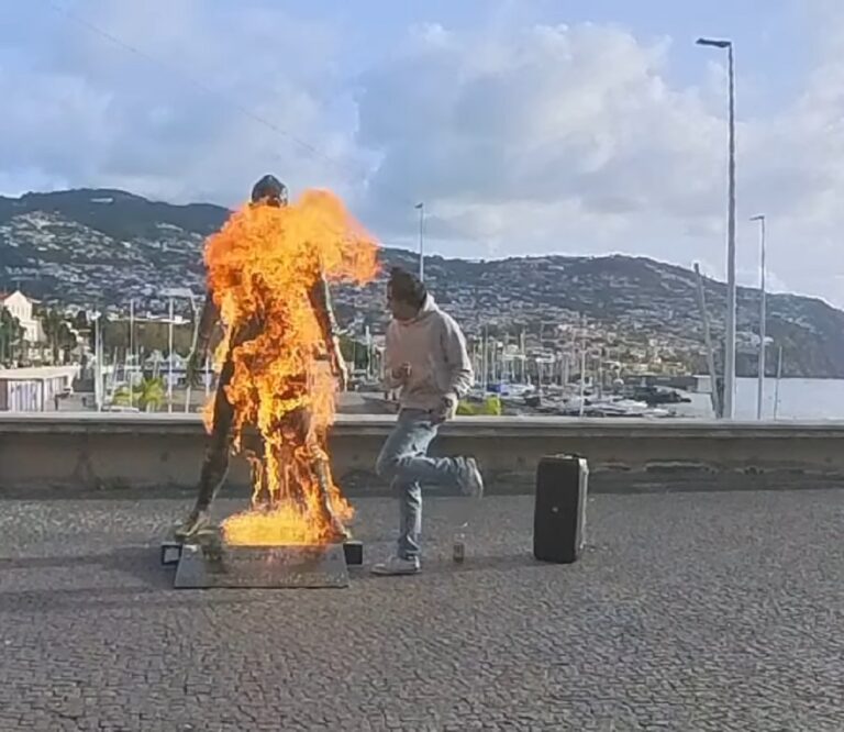 Video yang dibagikan di Instagram oleh pengguna @Zaino.tcc.filipe yang menjadi viral dalam semalam memperlihatkan seorang pria muda menyiram patung perunggu tersebut dengan cairan yang mudah terbakar sebelum membakarnya di luar Museum CR7 di ibu kota Madeira, Funchal.