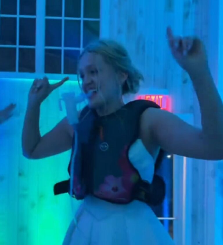 Dia terlihat berusaha sebaik mungkin untuk menari sambil mengenakan rompi osilasi khusus dengan nebulizer yang terjepit di antara giginya.