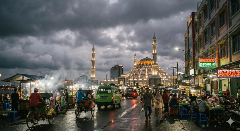 Ilustrasi Kota Makassar berawan di malam hari. (foto: AI Generated)