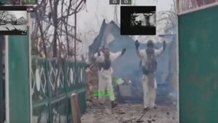 Robot yang dibuat oleh perusahaan pertahanan DevDroid menunjukkan tentara Rusia, salah satunya berlumuran darah, mendekati robot darat bersenjata dengan tangan terangkat untuk menyerah.